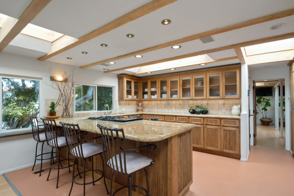 Catalina and Ocean views grace the top floor that is appointed with an entire wall of windows, beamed ceilings and gorgeous skylights. Entertaining your guests in the upgraded kitchen with stainless steel appliances, sprawling countertops, bar seating and wine chiller. Relax by the fireplace or enjoy sunsets from the western facing balcony just off of the living room. The primary suite features a private balcony, along with a tranquil handcrafted bath with stand-in shower.